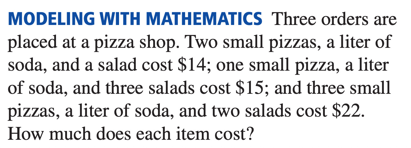 A small pizza costs $5, a liter of soda costs $1, and a salad costs $3.