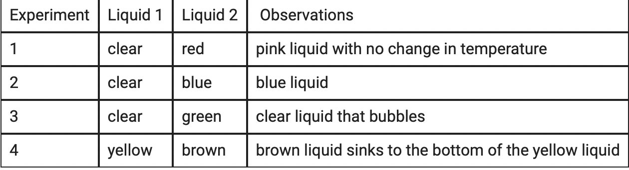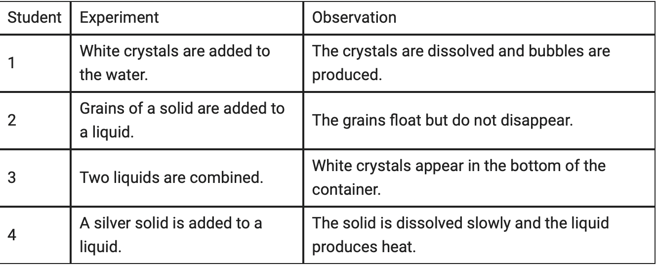 A student carried out four experiments combining two liquids. The table summarizes the liquids and solids that were combined and the student’s observations.