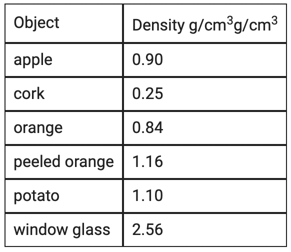 Glycerine has a density of 1.26 g/cm3. Saltwater has a density of 0.87 g/cm3.
