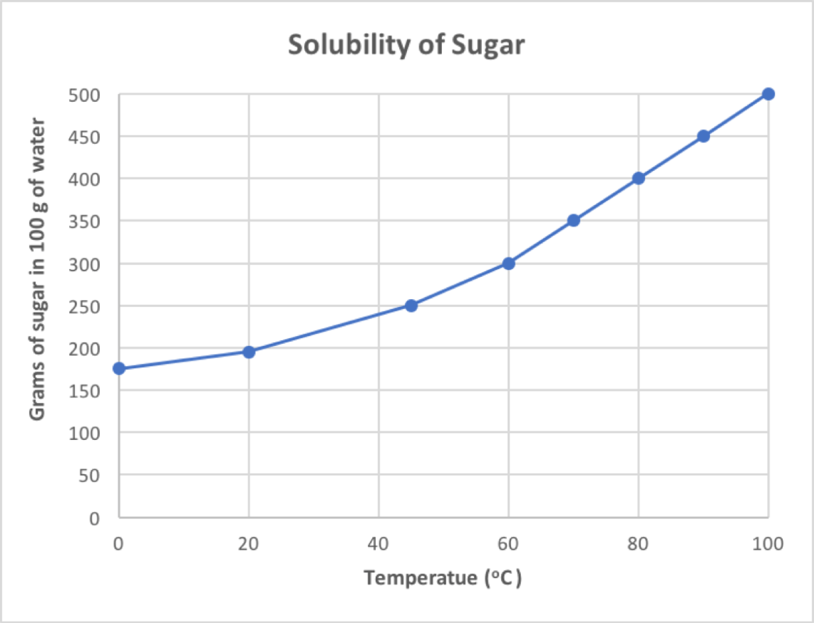 According to the graph, at what temperature does 300 grams of sugar dissolve in water?
