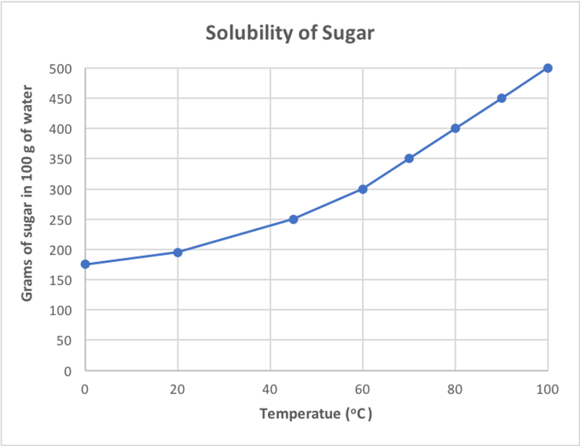 According to the graph, at what temperature does 300 grams of sugar dissolve in water?