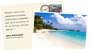 A card for sending a message by post without an envelope. It has a photograph. We send it during holidays to tell our friends what a great time we're having.