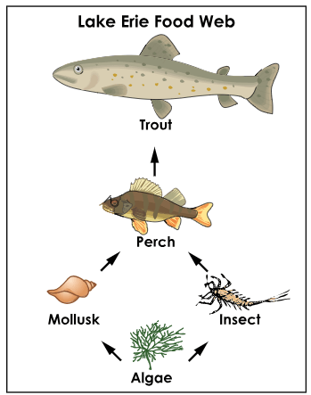 Perch are a type of fish that live in Lake Erie. A Lake Erie food web is shown.