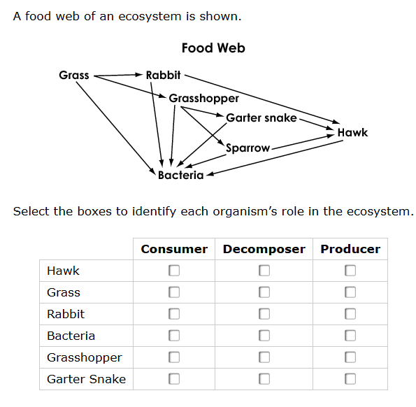 Consumers: Hawk, Rabbit, Grasshopper, Garter Snake