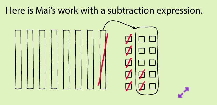 Mai used base ten blocks to solve 85-7. He drew 8 tens and 5 ones. Next, Mai decomposed a ten stick into 10 ones so he could take away 7 ones. In this diagram, it shows Mai crossing out a ten and turning it into 10 ones to solve his equation. His final answer was 78.