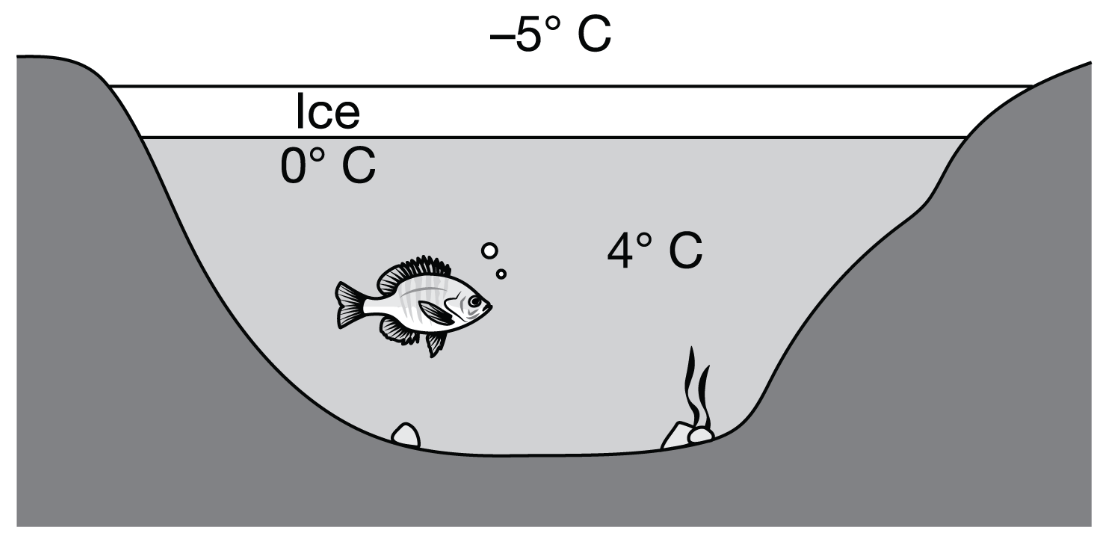 The water molecules in ice are farther apart than those in liquid water, so the ice floats, maintaining the warmer, denser water at the lake bottom.