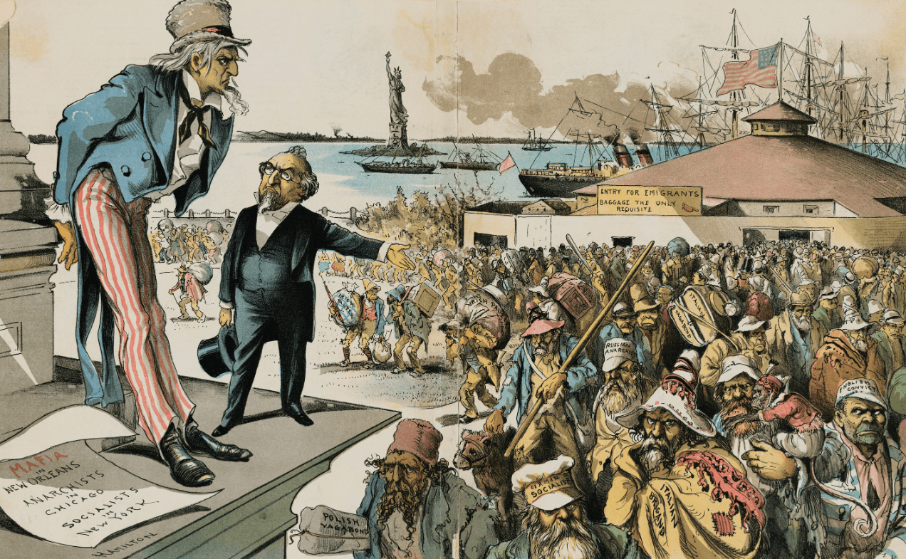 Uncle Sam is making that face to show that immigrants are generally unsanitary and bad for the image of the United States culture. Uncle Sam is blocking entry into the US capitol. The stranger is the immigrant coming into the country