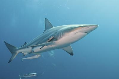 A remora fish cleans a shark while the shark transports the remora.