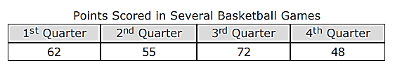 A basketball coach recorded the number of points scored by his team in each of four quarters over several games.  The table shows the results.
