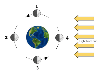 In order 1-4, identify the moon phases at each location on the diagram below.