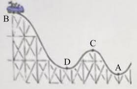 Point B is the highest point so the rollercoaster car has the most gravitational potential energy.