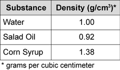 Look at the liquids and their densities below, if all of these liquids were poured into a glass, which would float on top?