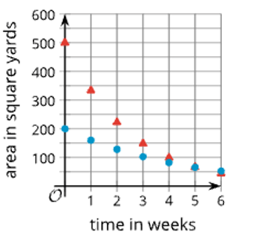 1. Red,triangular points - has a larger y-int. Begins at 500 sq. yards vs. 200 sq. yards of algae.