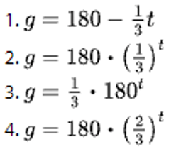 Jada received a gift of $180. The first week she spent a third of it. She continued to spend a third of what is left each week thereafter. Which equation best represents the amount of money she has over time in weeks?