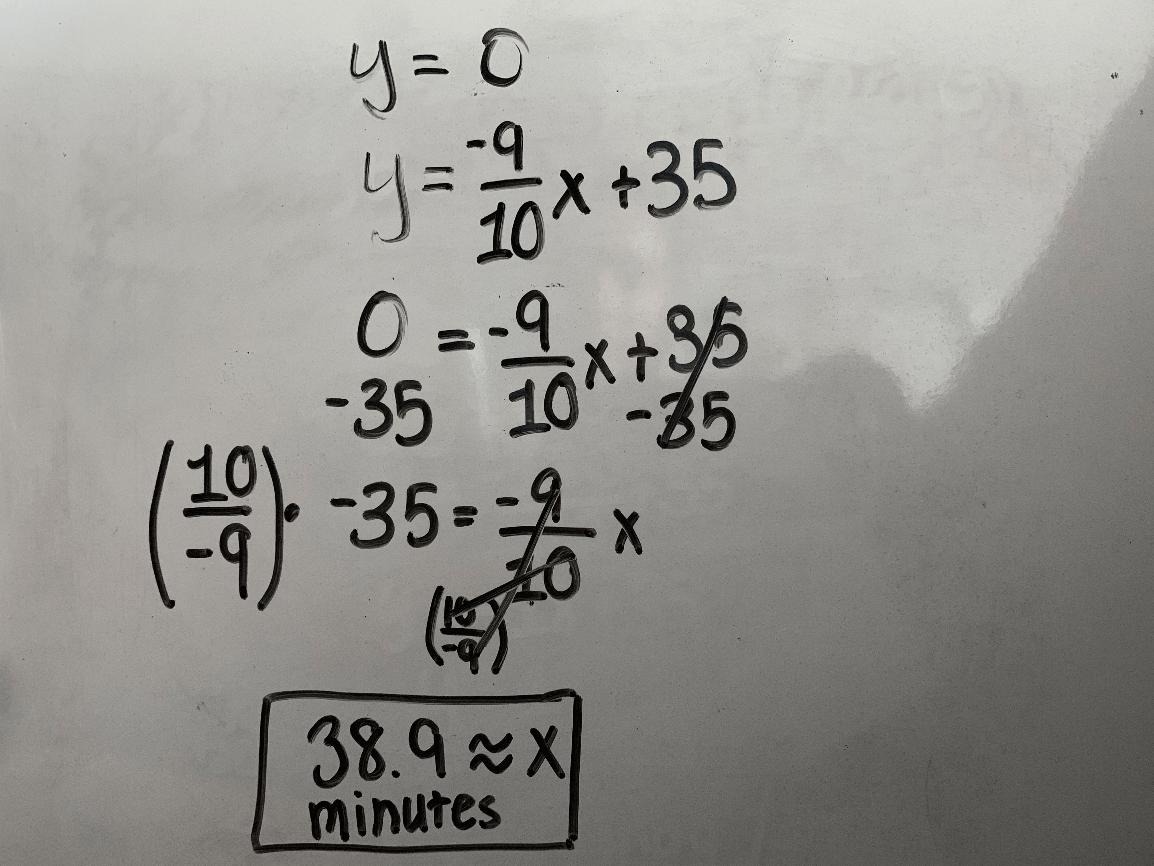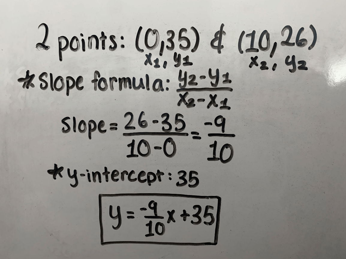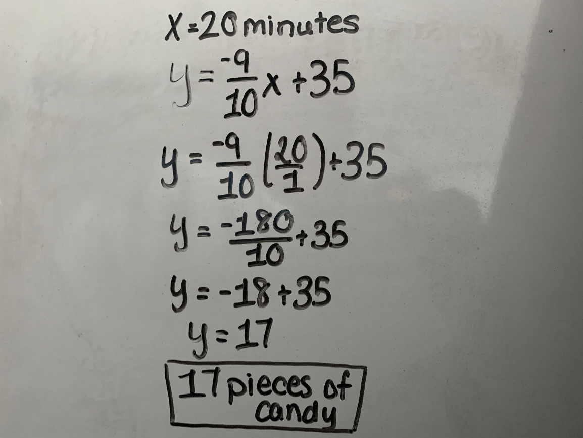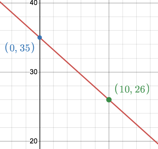 Ms. J. has 35 pieces of Halloween candy at the beginning of the period. 10 minutes into class, she only has 26 pieces of candy left. What is the y-intercept & what does it represent?