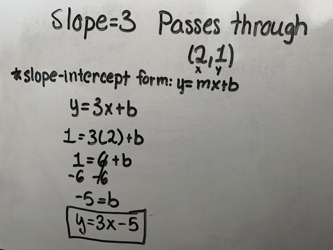 Write the equation of a line in slope-intercept form whose slope is 3 and passes through the point(2, 1)