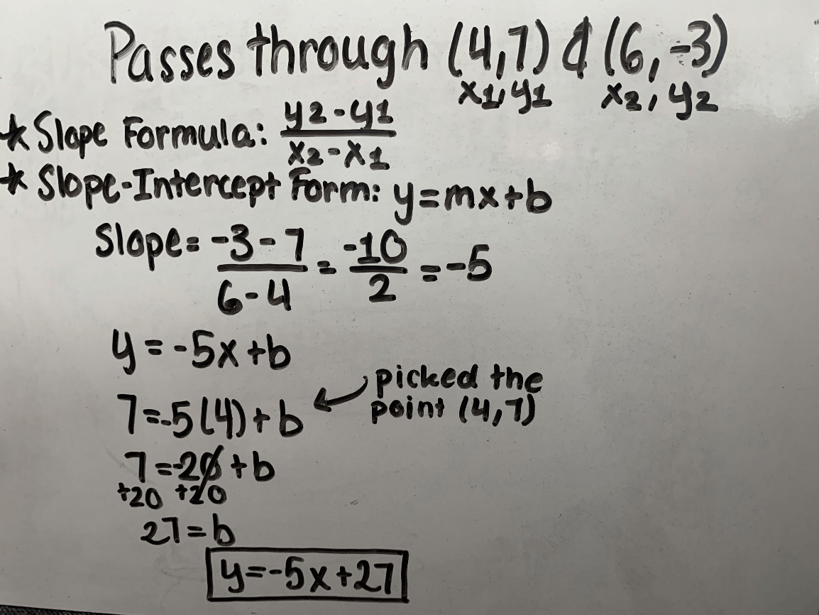 Write the equation of a line that passes through the points (4, 7) and (6, -3).