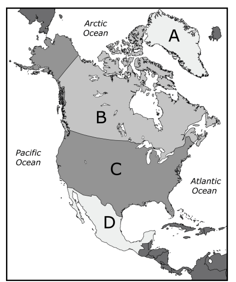 Which of the following letters indicates the correct location of Mexico on the above map?