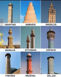 Tall towers (with spiral staircases and pointed spire) around mosques from which someone (a muezzin) calls Muslims to prayer