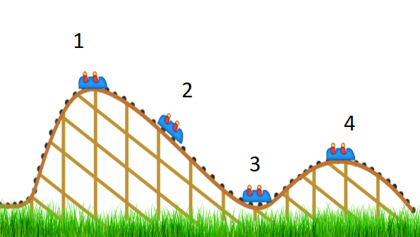 At what point on the roller coaster will potential and kinetic energy be equal?