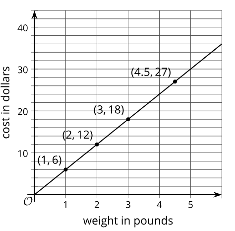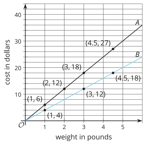 The graph shows the cost of pounds of two different brands of rice. Which line (line A or line B) shows the more expensive brand of rice? Explain.