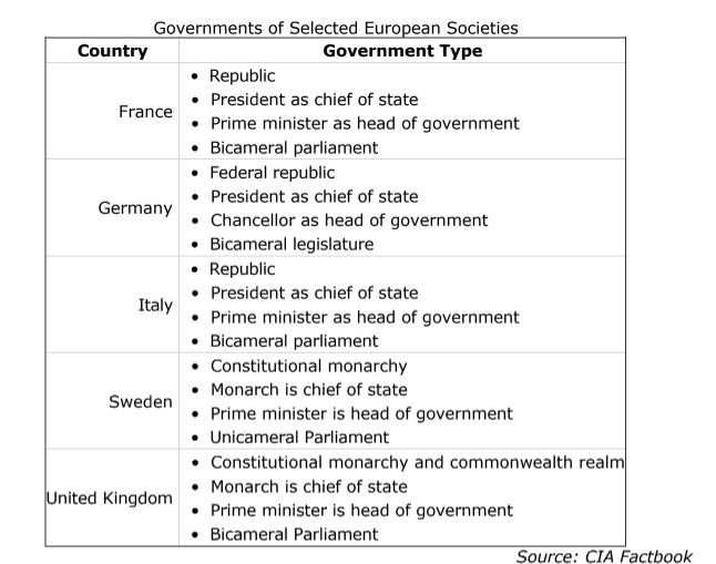 Based on the information in the table, what is one way that many governments in Europe are similar?