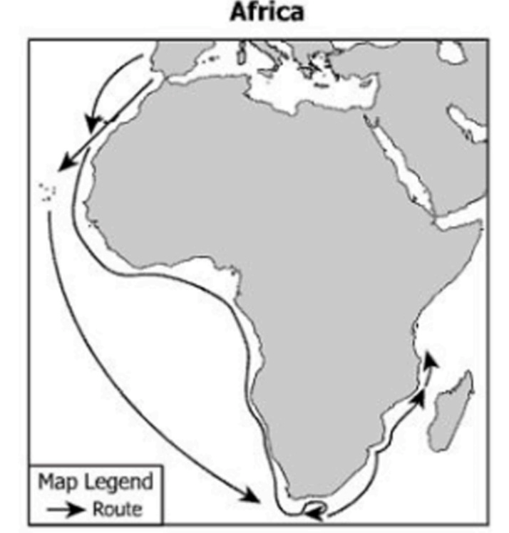 Which country sent explorers along the routes on the map below? France, England, Spain, Portugal