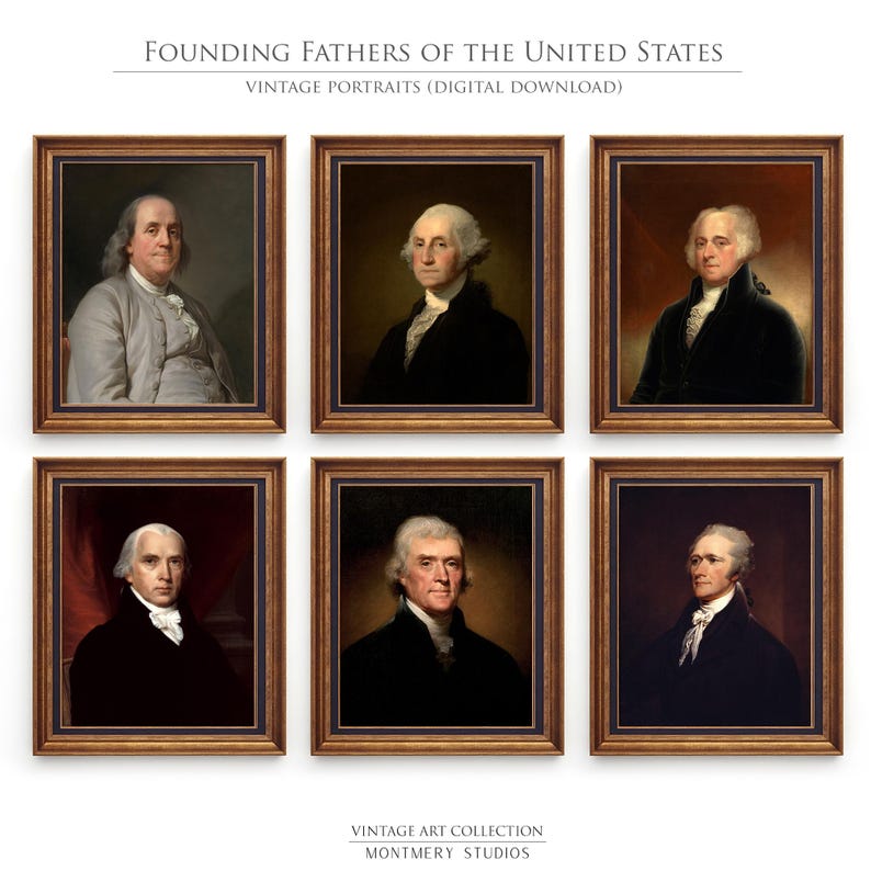 George Washington, John Quincy Adams, Thomas Jefferson, James Madison, John Jay, Alexander Hamilton, and Benjamin Franklin.