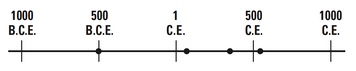 The dots on the timeline show about when Buddhism arrived in four different countries: India, Korea, China, and Japan. Based on the timeline and your knowledge, where did Buddhism arrive between 1 and 500 C.E.?