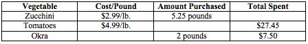 Fill in the missing pieces of the table.  Which type of vegetable costs the most per pound? What is the price difference per pound between each of three vegetables?