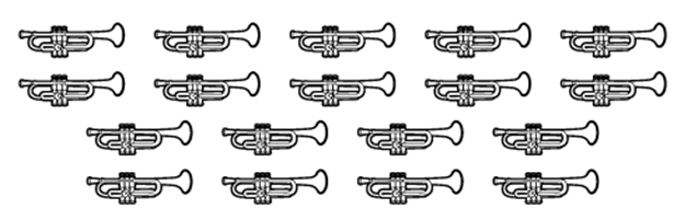 These trumpets will be placed in 3 equal rows. How many trumpets will be placed on each row?