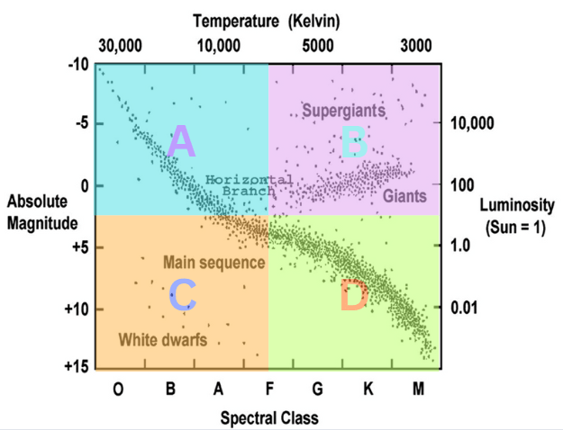 What is the general temperature and luminosity (brightness) of each quadrant of the HR diagram?