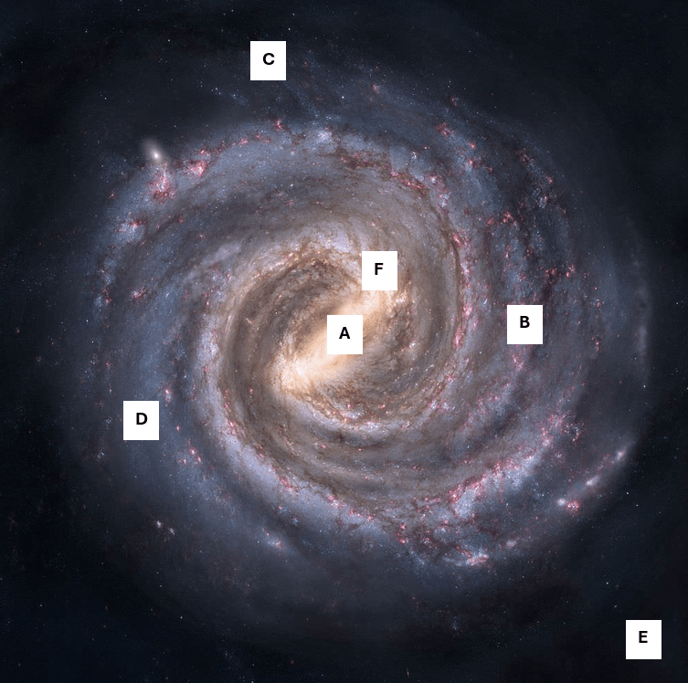 Our sun is located on a spiral arm about half way between the center and outer edge of our galaxy. Which point represents where our solar system is located within the milky way galaxy?