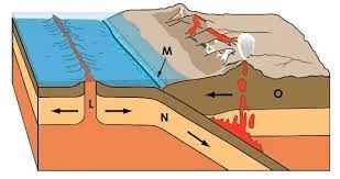 What type of boundary is represented by L? What geological feature would likely be found there?