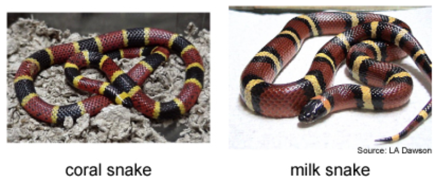 The coral snake is venomous. The milk snake is not. How does it help the milk snake to look just like the coral snake?