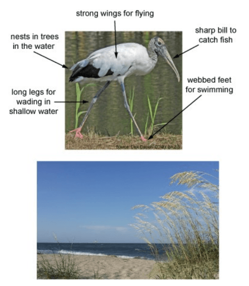 The first picture shows a wood stork. The second picture shows a coastal habitat. Why would it be difficult for a wood stork to live in the coastal habitat in the second picture?