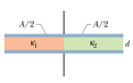 The figure shows a parallel-plate capacitor with a plate area A = 5.56 cm2 and separation d = 5.56 mm. The left half of the gap is filled with material of dielectric constant κ1 = 7; the right half is filled with material of dielectric constant κ2 = 12. What is the capacitance?