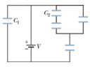 In the figure, the battery has a potential difference of V = 10.0 V and the five capacitors each have a capacitance of 10.0 μF. What is the charge on capacitor 2 (C2)?