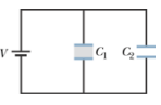In the figure, both parallel-plate capacitors are initially uncharged. How much charge is stored in both parallel-plate capacitors? One is filled with air, and the other is filled with a dielectric for which κ = 3.00; both capacitors have a plate area of 5.00 × 10−3 m2 and a plate separation of 2.00 mm. The emf of the battery is 12 V.
