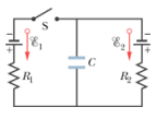 The circuit shows a capacitor, two ideal batteries, two resistors, and a switch S. Initially S has been open for a long time. If it is then closed for a long time, what is the change in the charge on the capacitor? Assume C = 10 µF, ε1 = 1 V, ε2 = 3 V, R1 = 0.2 Ω and R2 = 0.4 Ω.