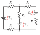 In the figure, the resistances are R1 = 1 Ω and R2 = 2 Ω, and the ideal batteries have emfs ε1 = 2 V and ε2 = ε3 = 4 V. What are the size and direction of the current in battery 3?