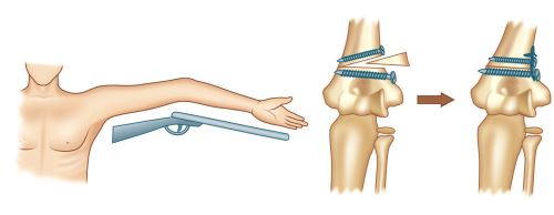 forearm deviates toward the midline (cubital varus), creating an inward angle resembling an old rifle stock; condylar