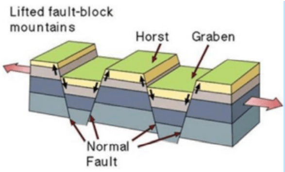 Fault block mountains result from what type of stress?
