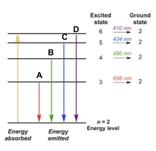 The color of light emitted when an electron drops from the 6th energy level to the 2nd energy level.