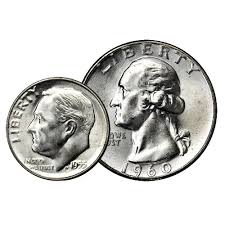 The small coin is a dime and the bigger coin is a quarter. Added together, they make 35 cents.