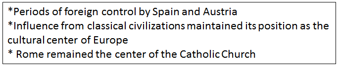 Identify the two factors that influenced the development of social and cultural patterns in Italy.