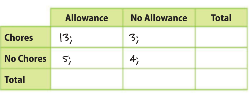 Use relative frequencies by row to find the percentage of kids who don't do chores but do get allowance.