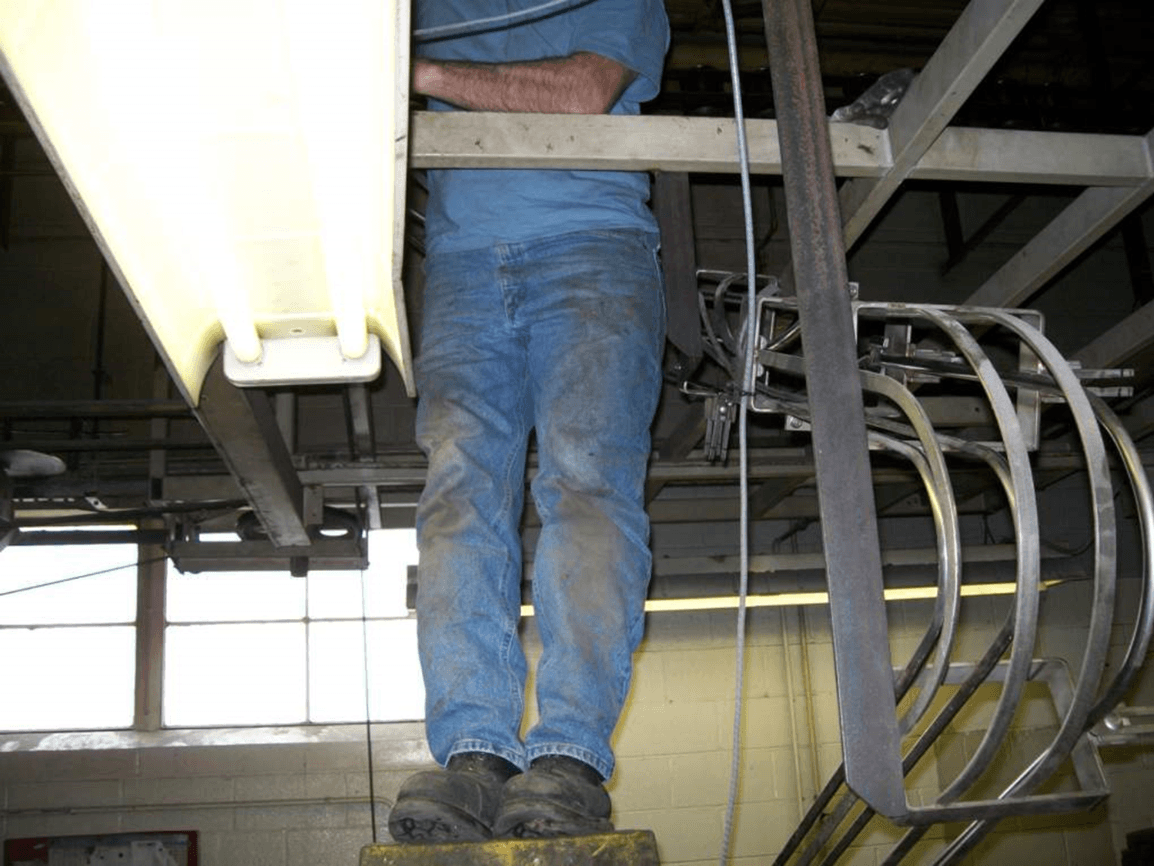 What is he is standing on the top Cap of the ladder which is not allowed?