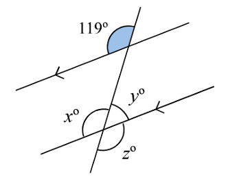 - state their relationship to the angle 57 degrees (are they CORRESPONDING, CO-INTERIOR, or ALTERNATE)?