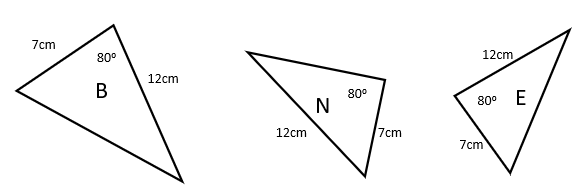 B and E are congruent using the SAS test (two pairs of sides are the same, and the angle between the sides are the same).